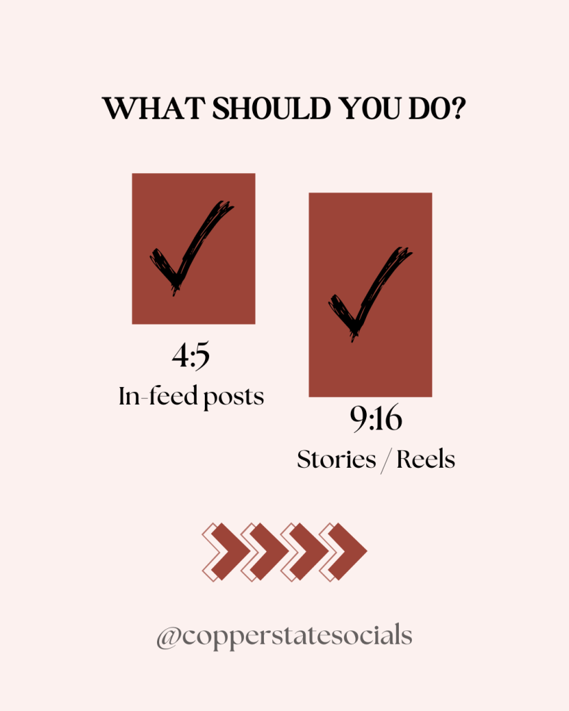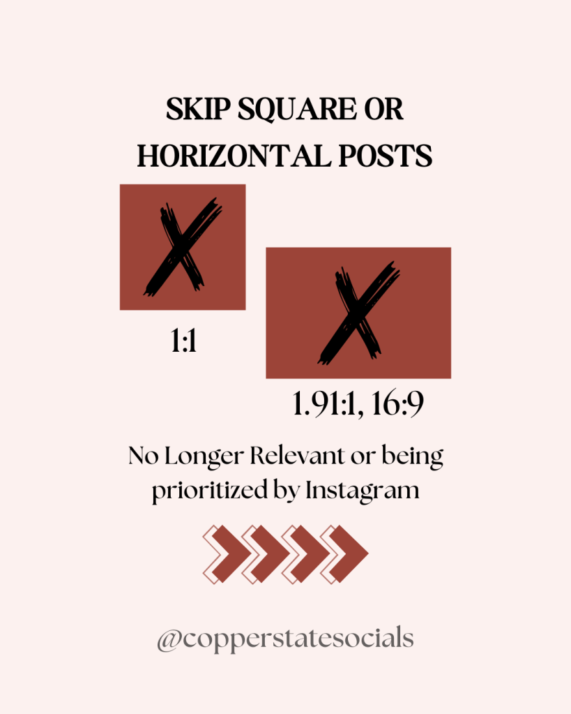 I would suggest creating your content strategy around Instagram’s preferred content types. A carousel post in a 4:5 ratio and Reels which 9:16 ratio. Both these are doing well with the right structure and can inspire viewers to follow your business if they see you’re staying up on the trends. Nothing screams, ‘boomer’ more than a square post in my home feed. And 9/10 it is a small business where they haven’t hired someone to create their visuals.