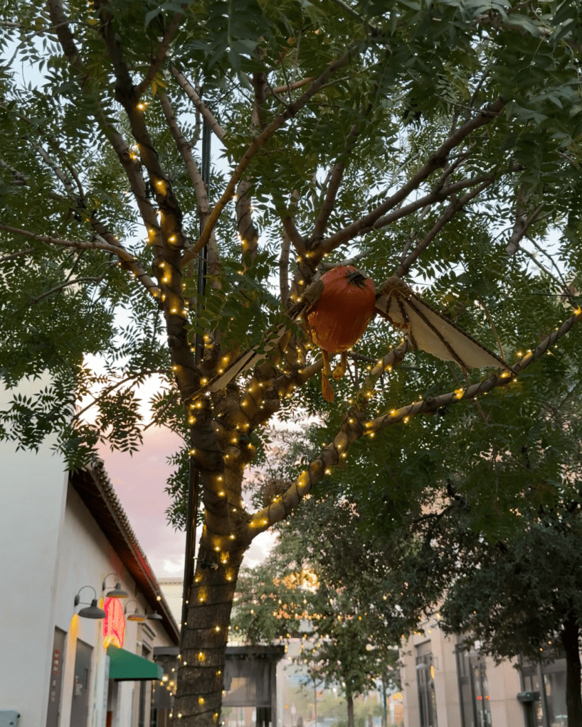 As you walk down Gilbert Road, look up at the seasonal street light decor! My favorite was peeping a pumpkin at the corner of Vaughn Avenue and Gilbert Road. Did you see it?