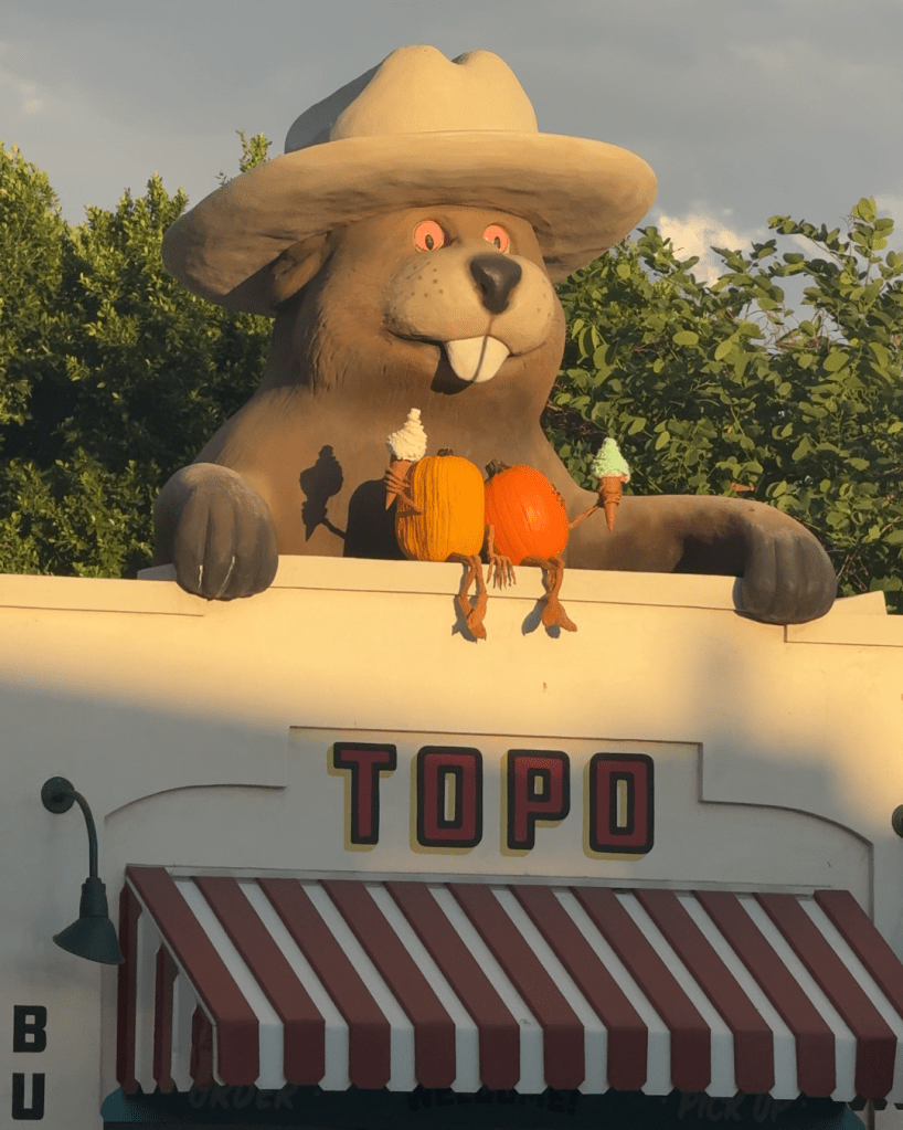 Stepping back out, and looking toward the north, two more gourds sat in front of the beady-eyed gopher at Topo, enjoying ice cream as tall as the cones customers below enjoy.