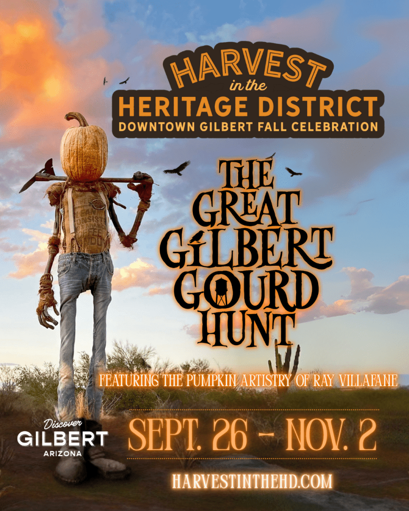 The Great Gilbert Gourd Hunt features the artistry of Ray Villafane and his popular, comical pumpkin displays. Nearly a dozen pumpkin vignettes, featuring more than 40 in-character gourds, will take over the Heritage District. Watch as mischievous pumpkins cause chaos and bring whimsy to the historic downtown area!