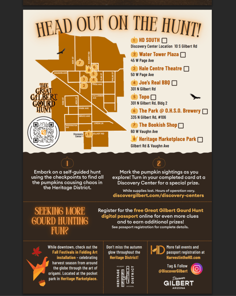 Visitors to the district are invited to sign up on their mobile device for a digital passport and get led by GPS to pumpkin vignettes throughout downtown. A digital check in is required at each spot. Turn in your completed hunt card or show your digital passport at a Discover Gilbert Discovery Center for a pumpkin prize (while supplies last).